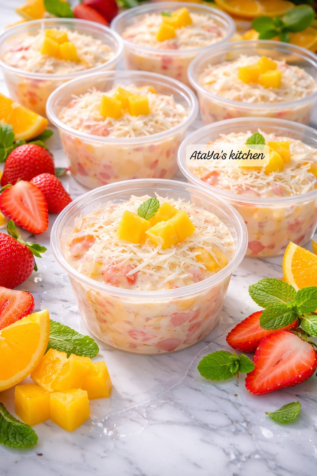 Salad Buah Creamy ini berisi campuran buah-buahan yang segar dengan saus creamy manis yang lembut. Di atasnya ditambah keju parut yang melimpah dan topping potongan mango yang bikin rasanya makin fresh dan mewah. Cocok buat dessert dingin siang hari, stok di kulkas, bingkisan, atau menu jualan yang selalu dicari karena tampilannya cantik dan rasanya aman buat banyak orang.